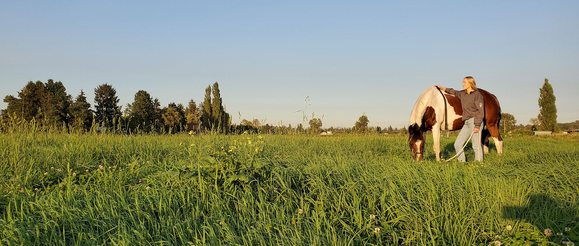 On the right side of your horse, adjust the length of the snap end to fit around your horse’s right leg and attach it to the D-ring high up close to your horse’s withers.